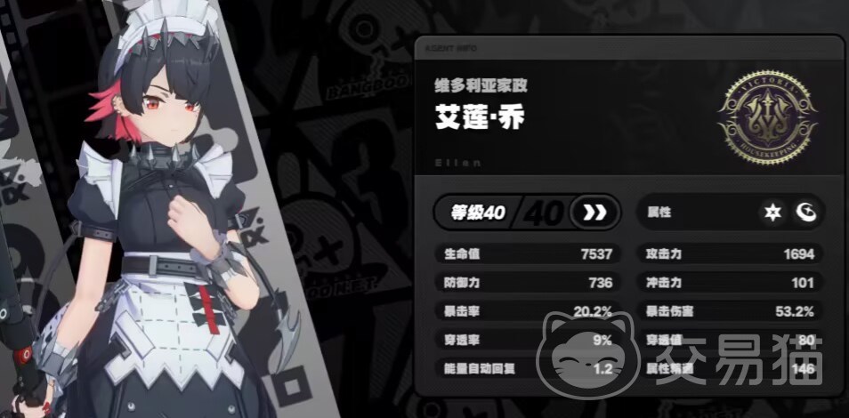 鲨鱼娘的名字叫做“艾莲·乔”,冰属性,斩击类的角色,也是目前游戏里的S级角色(游戏中稀有度分为S和A)。艾莲乔一身女仆装扮,与丽娜、莱卡恩同属于“维多利亚家政”势力。