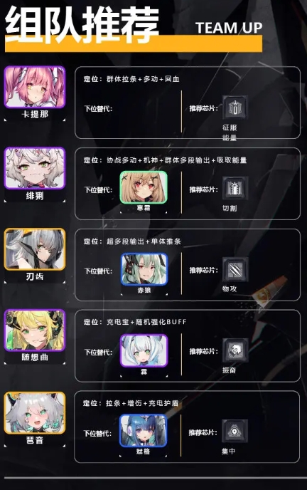 这套阵容的能力是非常强的,拥有拉条和多动能力,在速度上优势很大,行动力强的同时大家也能去配合绯猁的协战,让对手处于被动状态的同时,轻松的击败它们。
