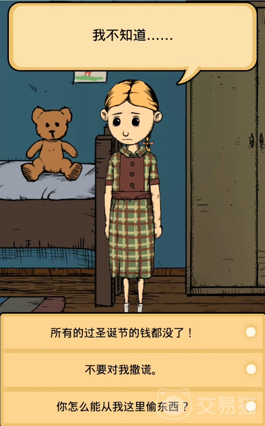 之后一段时间内,孩子会向玩家介绍她在学校里的情况,例如老师更喜欢哪位学生,孩子是否交到了朋友等,但没过多久玩家就会发现小猪存钱罐空了。这时,若玩家想要继续推进该剧情,则需要连续点击小猪存钱罐,从而才能获取到相关的提示。等孩子回家后,玩家就存钱罐里的钱去哪了询问她,会得到她将钱拿走的答案,从而完成调查存钱罐的剧情。