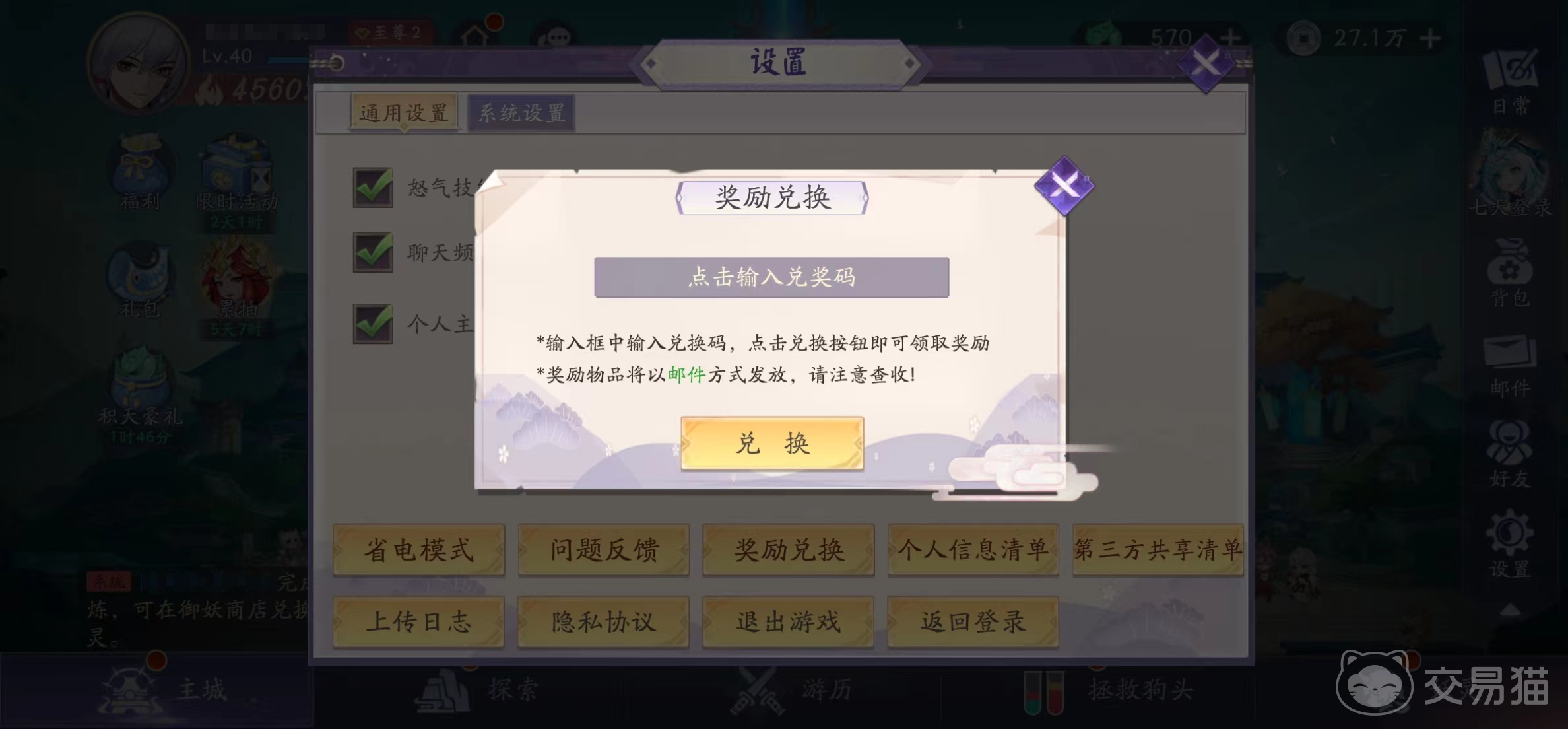 3、进入到兑换界面后在“输入框”中输入(复制粘贴也行)上边为大家准备好的码,点击确认按钮即可领取奖励。