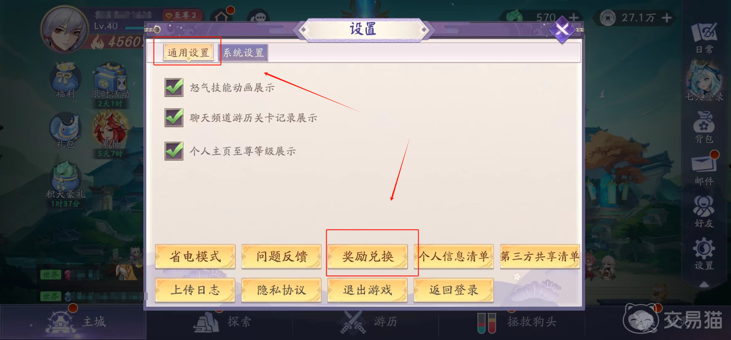 2、进入到设置界面后点击左侧菜单栏的“通用设置”,在通用设置的下面位置会有一个“奖励兑换”,这个就是兑换码的兑换入口了。