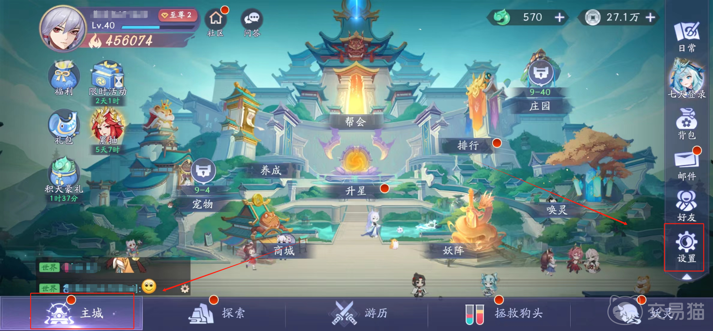1、需要进入到主页面的位置,然后点击左下角菜单栏的“主城”按钮,进入到主城后点击最右侧菜单栏下面的“设置”按钮。