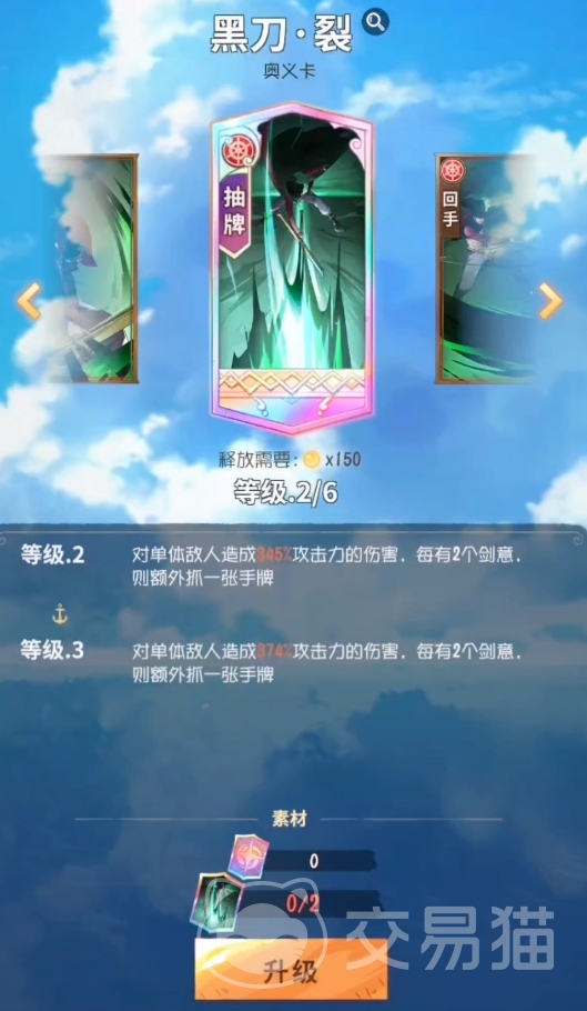 大招“黑刀·裂”同样还是单体攻击技能,但二级就有着345%的攻击力加成,可以算是鹰眼伤害最高的一个主动技,并且这招在使用后会根据鹰眼所拥有的剑意来额外抓取对应数量的手牌,多出的手牌都能在后面起到非常关键的作用。