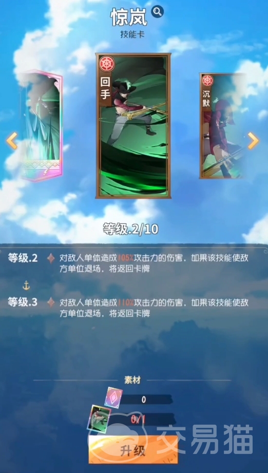 主动技第一个是“惊岚”,效果是对敌人造成单体伤害,如果击败敌人这张技能卡则会返回卡牌,意思就是将敌人击败后这张卡可以在后续返回你的手牌里,换言之也就是能在下回合继续使用,如果敌人都是残血的话,那么就会形成连续使用该技能斩杀的局面,不过这招的初始攻击力加成不高,需要升满十级后才能呈现一个可观的威力。