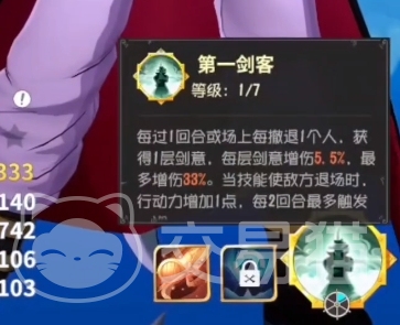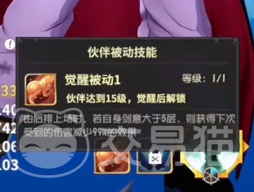首先是两个觉醒后的被动技能,第一个在15级觉醒后解锁,其效果是由后排上场时如果剑意大于五层就会在下次被攻击时,减少99%的所受伤害,基本上接近于无敌了,不过只有一次。