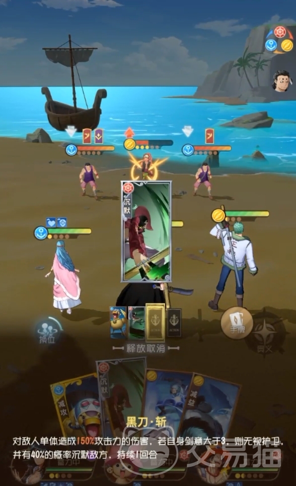第二个技能是“黑刀·斩”,使用后也是对单体敌人造成一次伤害,不过基础加成倍率会比一技能更高一些,而且这招在自身剑意处于三层以上时会无视敌人的护卫,同时还有40%几率能让敌人陷入沉默。