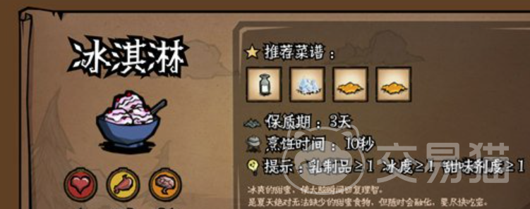 首先,大家需要掌握冰淇淋的配方。可以使用一份牛奶,加冰块以及两份糖,就能够制作出来,烹饪时间为10秒,但是需要在三天之内将它吃完,不然就会变质无法使用。