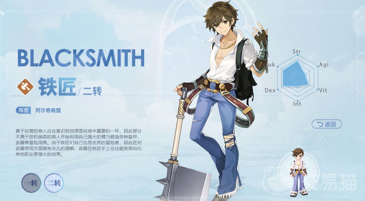 前期唯唯诺诺,后期重拳出击的典型代表,铁匠在一转是商人的时候战斗力很有限,很多打副本的玩家都比较嫌弃他们,但是当转职到铁匠以后,他们不仅有强大的装备来提升实力,技能本身也进行了质变,属于咸鱼翻身的典型代表。