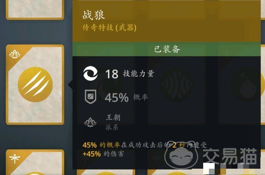 传说特技的获取难度较高,培养成本也是所有技能里最大的。但它们的技能效果很突出,通常能极大地提升玩家们的战斗力。十分推荐的是王朝流派的战狼这个传说特技。光听名字就知道它是攻击型的技能,实际上它也十分强力。