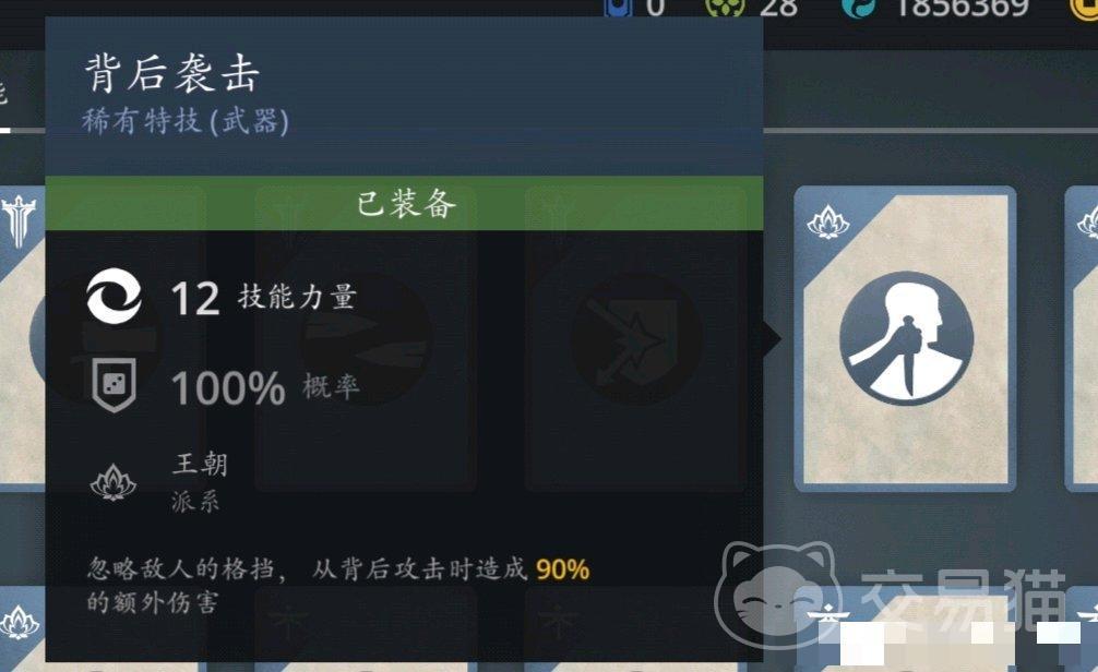 在稀有特技里,如果你是喜欢王朝流派的玩家,那么你一定不能错过背后袭击这个技能。这个技能可以让拥有背后袭击buff的玩家的下一次攻击必定触发破防,并且使得基础的伤害增加90%。背后袭击虽然只是最易获得的稀有技能,但十分的有用处,稳定的破防和增伤能让玩家们很好地对敌人造成高额的输出。而且较高的获得几率和较低的培养成本也能让玩家比较轻松地就达到满级,获得更好的技能效果。