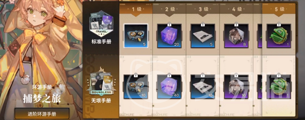 在游戏主界面的上方点击手册按钮就可以进入到手册的查看界面,大家会发现游戏已经向我们赠送了一个标准手册,可以领取到部分的奖励。除此之外还有一个需要付费解锁的进阶环游手册【捕梦之旅】。其实奖励的内容跟免费手册基本上是一样的,只不过数量方面差不多是翻倍了。