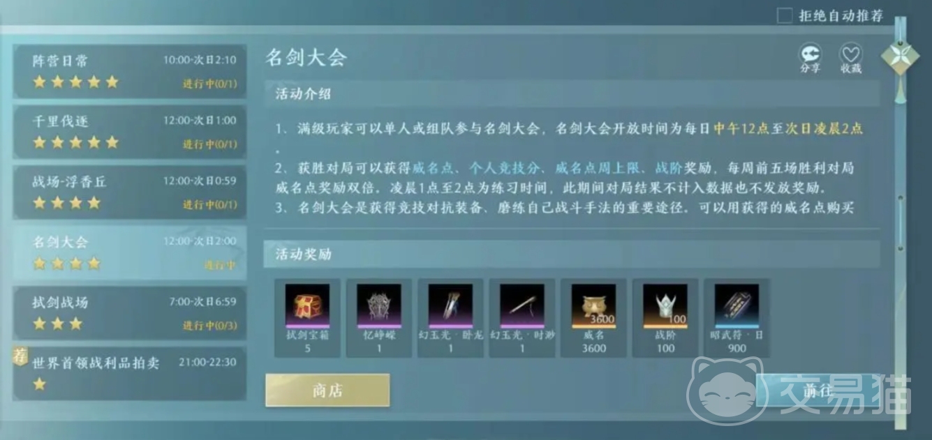 如果各位对于这种阵营与阵营之间的对抗不感兴趣的话,那么各位也可以参与名剑大会以及试剑战场这种不需要加阵营就可以参加的玩法。这同样是不少玩家们最喜欢的副本内容之一,大家常说的JJC就是名剑大会。这也是很多不加阵营的中立玩家获取PVP装备的主要途径,也是不少玩家最主玩的副本内容。