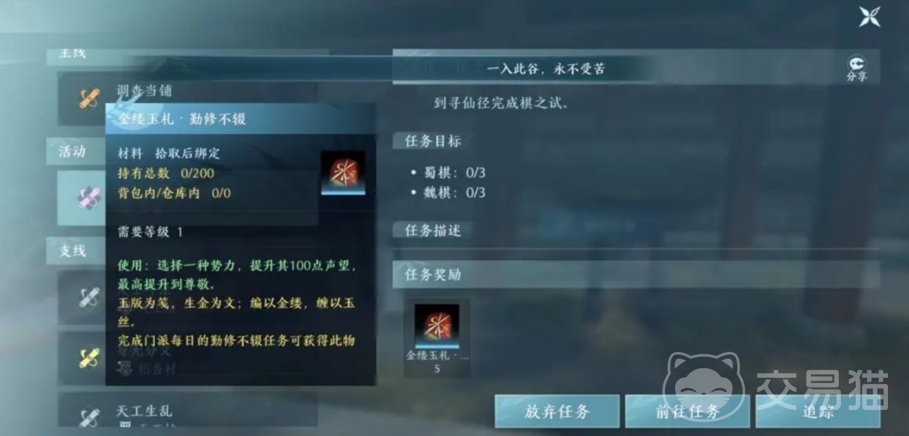 之后就是门派副本,属于各个门派都会发布的相应任务。各位可以直接在任务总览当中寻找到自己相应门派的副本任务并完成。一般情况下都会获得这个金缕玉札,可以使用之后提升相应势力的声望。只有声望达到一定要求之后,才可以在某个市里购买兑换一些较为稀有的物品,可以算是我们必做的任务副本之一。