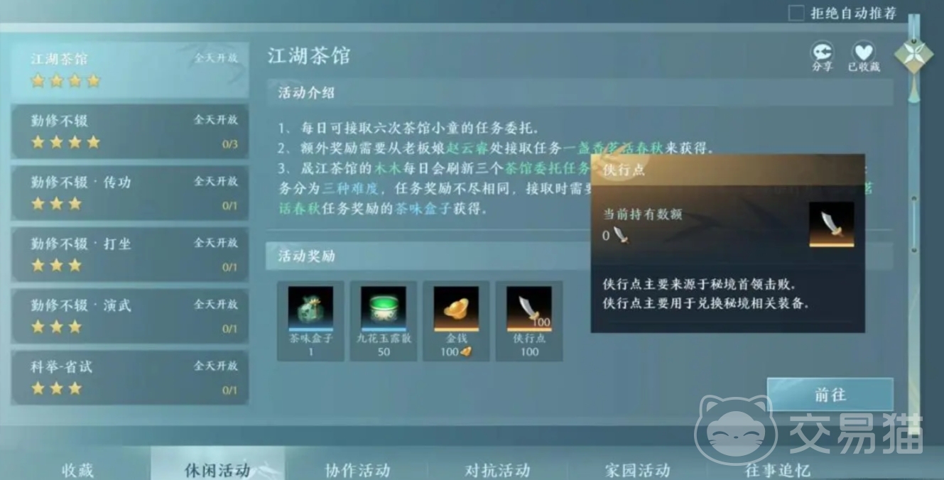 其中,比较典型的就是我们的江湖茶馆。各位可以根据日历当中的指引,直接前往任务地点进行相应副本的刷取和任务的完成。打完之后可以获得侠行点数,并通过该点数去兑换更多的装备。