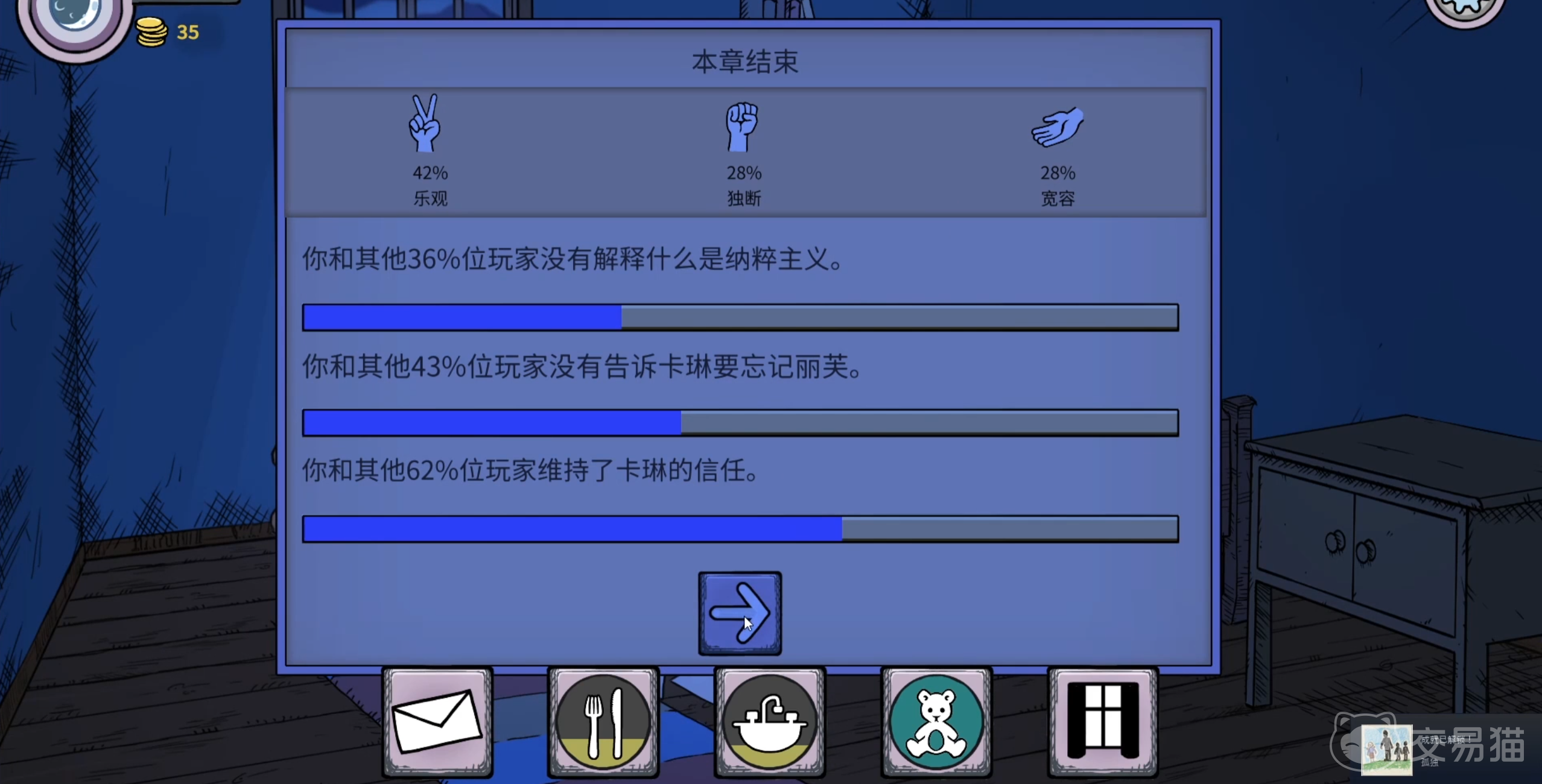 其实隐藏的彩蛋就是其他的两种结局,第一个结局是大家老老实实过完整个流程后的结局,大家会带着孩子躲在树林里面看着新到国王,最后对这个小镇充满失望,带着孩子离开的结局。这个结局只要玩完六个章节都会触发,一般情况下也都触发的是这个结局。