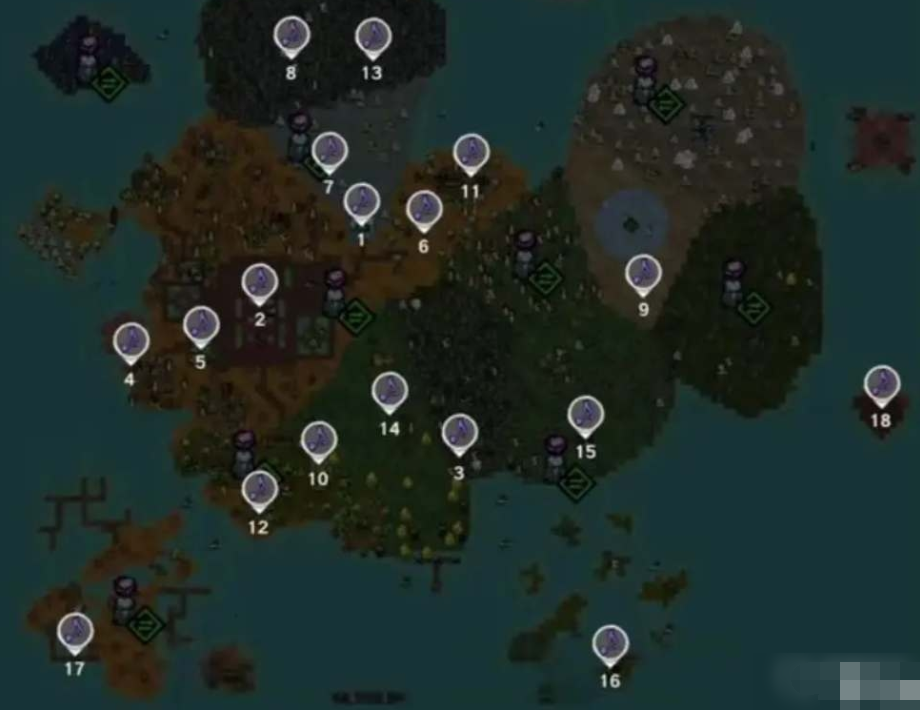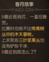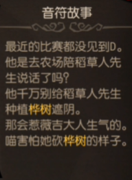音符9:在地图的右侧,有一个森林的传送点,向左走进入草原,和音符7一样,需要寻找一些“有点奇怪的花”,成功找几轮后就可以得到音符。音符10:在桦树森林的附近,出了传送向右走,找到有三棵大树的地方,其中两棵树前有猫草,音符就在中间那棵树前,需要补种一棵猫草,不用施肥。音符11:在初始出生地左上方找到一个稻草人,旁边三叶子浆果丛,用铲子挖掉就可以得到音符。音符12:在桦树林的传送点附近,向右下方走,这里的田地布置了一个稻草人,有四个农田围着一棵桦树,砍掉这棵树,并用铲子挖掉树桩,就可以得到音符。