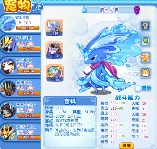 首先推荐的就是碧水灵兽,对于新手玩家比较友好,新手玩家或者已经回归的玩家,利用这个灵兽可以轻松应对各种任务及场合。这个灵宠精力152、攻击力140、防御123、魔攻101、速度为109。从各方面数据来看是非常不错的,无论是新手玩家还是回归玩家都能轻松。
