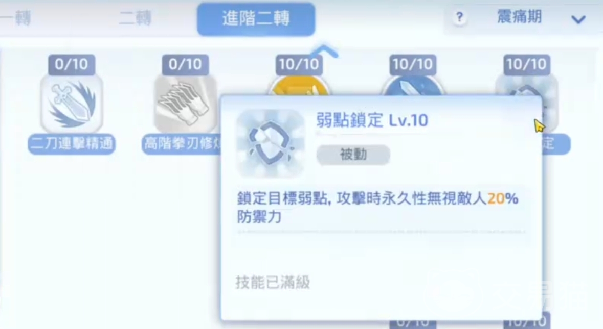 最后的最后就是二转的满级技能弱点锁定,这也是该职业最强的技能。锁定目标的弱点攻击,永久性无视敌人20%的防御力。简单来说,就是无论打哪一个角色,该技能都能够对敌人造成20%无视护甲的真实伤害,搭配角色本身就有的高伤属性。即便对面是全重甲敌人,也能够打出非常卓越的伤害输出,相当好用。