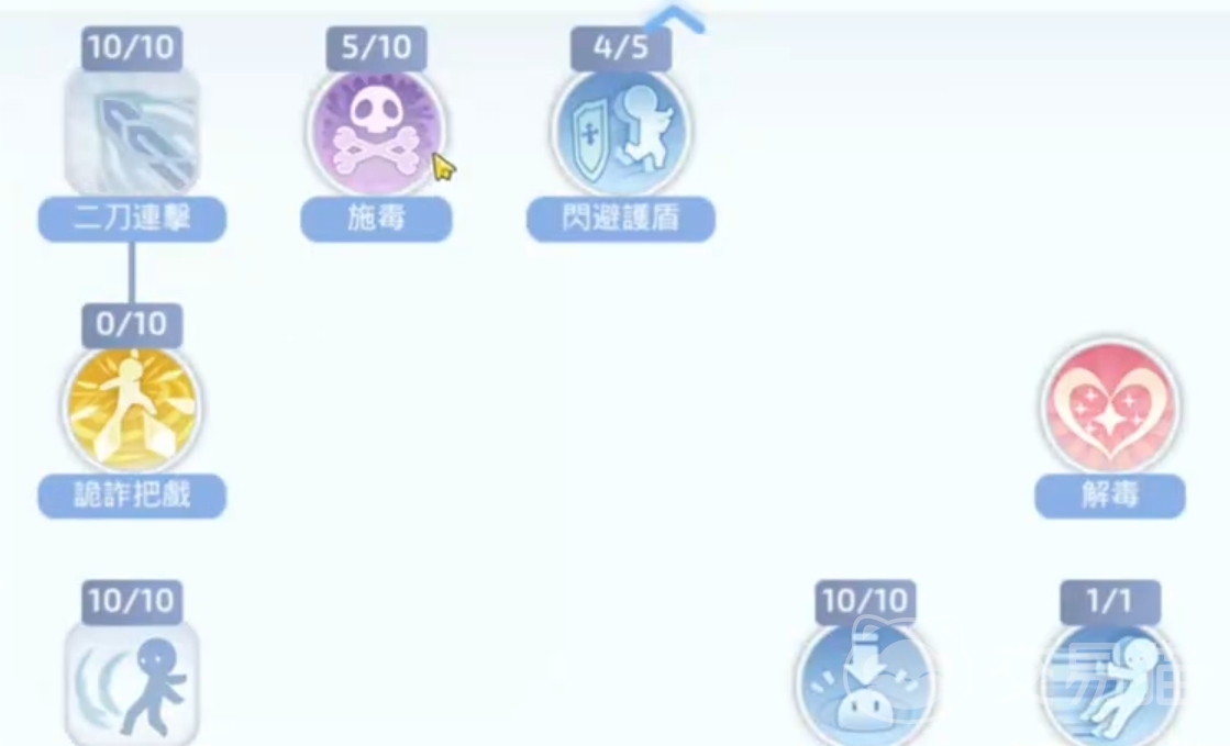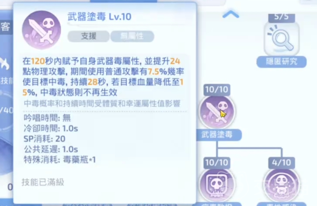 转职之后刺客方面,优先对于左右手锻炼进行加点。他能够让我们左手右手主副手都可以装备武器,并且都装备武器的时候还会保留90%的攻击力,让我们攻击伤害频率得到进一步提升。并以此基础上,再将我们的技能武器涂毒给点满。在120秒内赋予自身武器毒属性状态并额外提升物理攻击力期间,攻击有一定几率让敌方中毒,不断消耗血量。