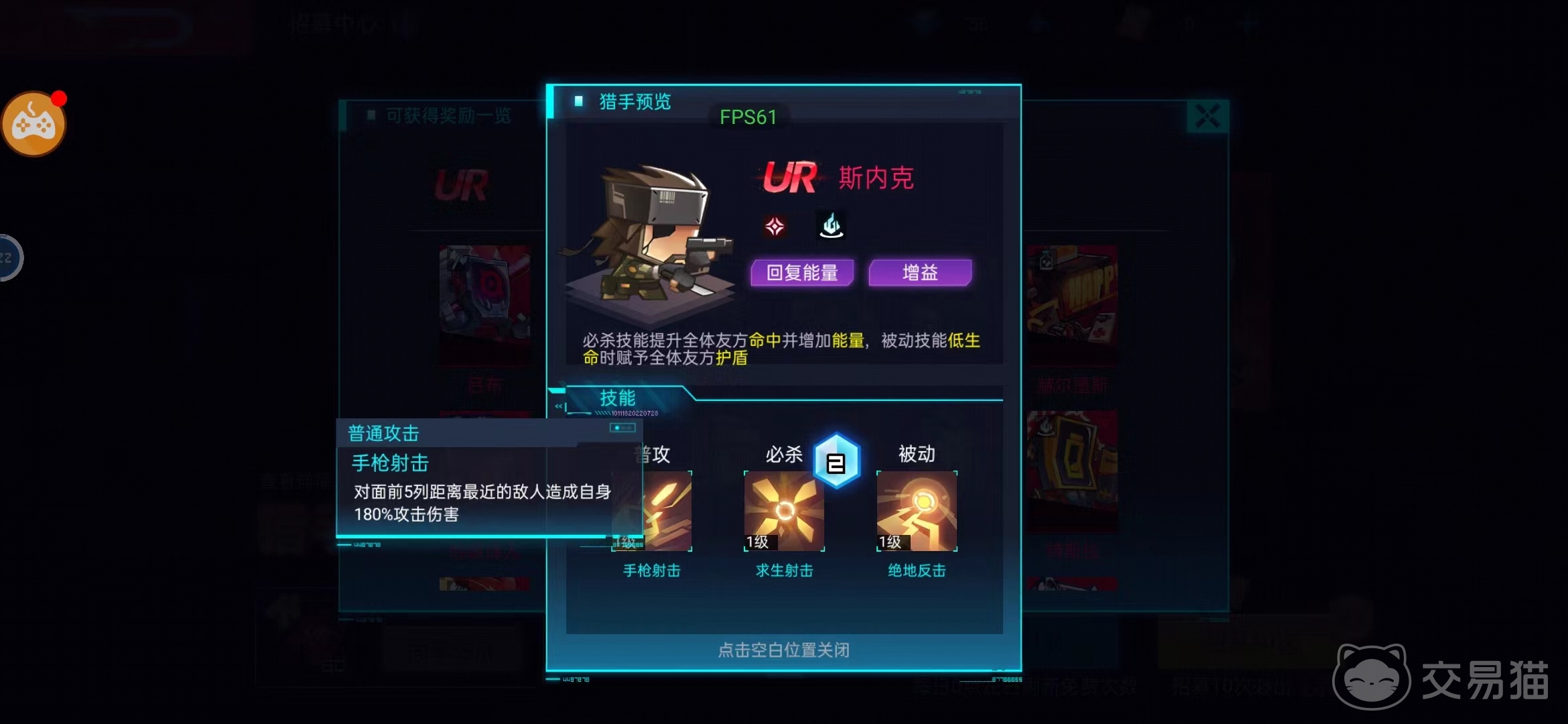 斯内克:它是一个自身就带有一定增益效果的角色,释放手枪攻击的时候可以对面前5列距离最近的敌人造成自身180%攻击伤害,必杀技可以对距离最近的8名敌人造成220%攻击伤害,同时增加全体友方20%命中,这样的效果一样是持续10秒时间之后再增加3点能量,而被动技能则是一个反击的技能,可以在自身生命首次低于50%时,赋予全体友方自身200%攻击的护盾,这个护盾也是可以持续十秒时间的。