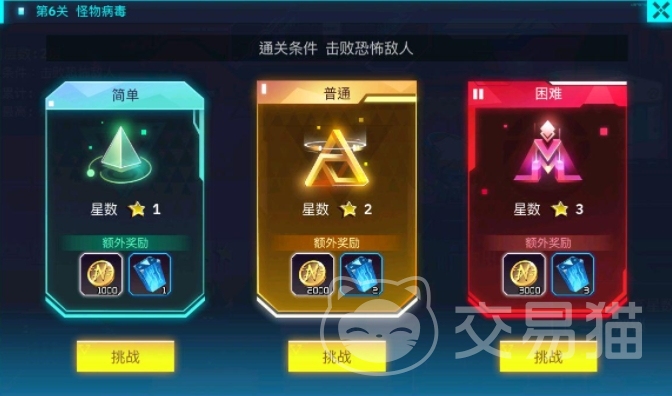 无论是在角色养成还是病毒入侵挑战中,玩家可以用自己掌握的技巧来克服难关,再取得胜利拿到相应的奖励,随着游戏进程的推进,玩家将面临越来越难的关卡,比如在病毒入侵挑战中,玩家将面临每一层的三个不同难度级别为简单、普通和困难,简单难度的奖励和星级评分最低,而普通难度提供稍高的回报。困难难度则代表着最高级别的奖励,通关这些关卡能够获得3星级的最高奖励。