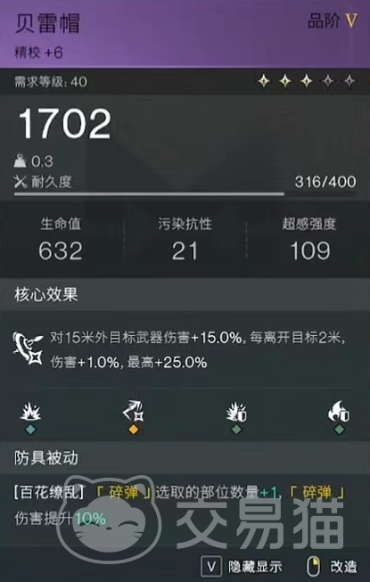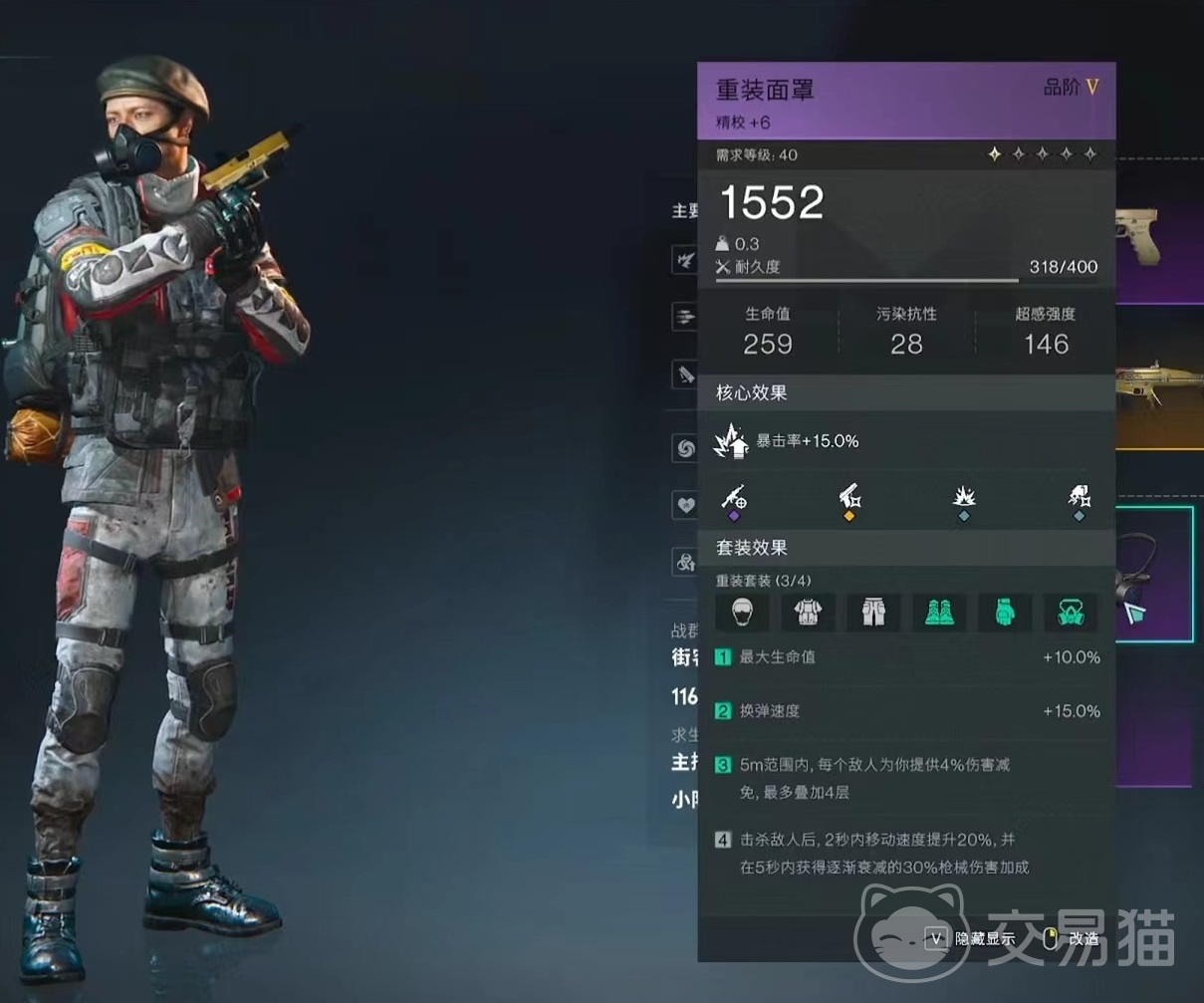 现在使用步枪的玩家最喜欢的就是碎弹效果,也就是在命中弱点时有较高几率触发特效,以及在武器活化后,概率还能提升到100%。这样在防具选择方面也要突出这一点,在头部方面可以穿戴贝雷帽,装备上被动百花缭乱,可以使碎弹选取部位数量加1,碎弹造成伤害提高10%。然后是重装面罩,重装套装穿戴三件就可以,我们只需要用到三件激活的效果,包括提高最大生命值,提高换弹速度,以及在5米范围内敌人数量提供的伤害减免等。