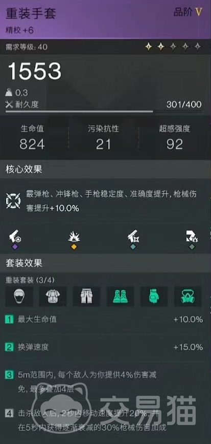 然后是重装手套,它的核心效果是提高枪械伤害,还有重装鞋特点是在武器活性化期间提高暴击伤害,这些对于步枪的输出都是很有好处的。然后选择的是特勤上衣和特勤长裤,这样获得两件特勤效果,稳定度加15,最大生命值加15%,稳定度对于中远距离射击是很有帮助的,特勤上衣还可以减少躯干受到的伤害。