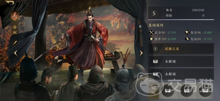 孙权:他是游戏中的一名输出类武将,拥有卓越的领导能力,可以作为主将来出征,即便单独出战,孙权也能够展示出他的强大实力,尽管如此目前最理想的策略还是将他作为队伍的一部分来搭配,孙权能与多种武将组合产生强大的攻击效果,因此将孙权纳入各类队伍查看效果可以让大家最快选出适合自己使用的阵容。