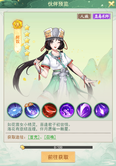 【阿奴】作为队伍中的上位输出,是整个队伍中的核心存在,阿奴在前期的话,如果玩家们选择零氪的话,那么就需要在限时卡池中,去进行抽取了,不过游戏刚开服,根据活动所赠送的抽奖券,是完全可以保底抽到阿奴的,如果大家决定小氪一下的话,也可以直接花费6元人民币直接拿下阿奴!阿奴的话,只要激活了,就可以和逍遥触发出连携技能,在攻击的时候,阿奴会使用蛊毒来对敌人造成持续性的伤害,在刚开始攻击的时候,可能看起来不太痛,但是在绝技释放后,这个毒素是可以叠加5层的,效果就会慢慢的显现出来了!随着回合就会发现敌人的伤害会慢慢的降低,那是因为这个毒素不仅仅只是造成伤害,同时还有减精力值的效果!