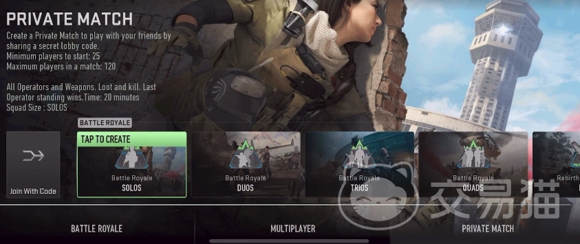 总之pve场次足够之后就可以轻松进行联机,除了能够通过匹配的形式来与其他玩家联机对抗,也可以加入他人的房间,或者自己创建房间,这些分别可以在“battle royale”旁边的两个选项完成。