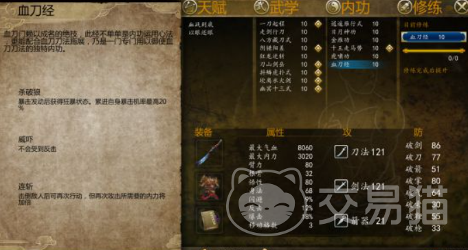 血刀经是血刀老祖的独门秘籍,后来传承给了狄云,在游戏里大家在赛王任务后就可以获得这本功法。小编首先推荐的是把血刀给了二师兄雁行。虽然二师兄连斩的技能在学习血刀功后由于机制的问题不能再用连斩,但是血刀功带来的属性增益远超连斩带来的伤害。所以还是可以带血刀的。