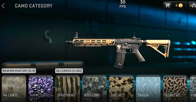 这里拿游戏中比较热门的枪械CAMO SELECT - M4 CAMOS来举个例子,这款枪械的皮肤【locked】只要玩家们在游戏中击杀50个敌人就可以获得了,而且是累计击杀,并不用玩家们一局达到击杀分数才可以!是不是非常的简单,目前游戏中只有这三种获取皮肤的方式!