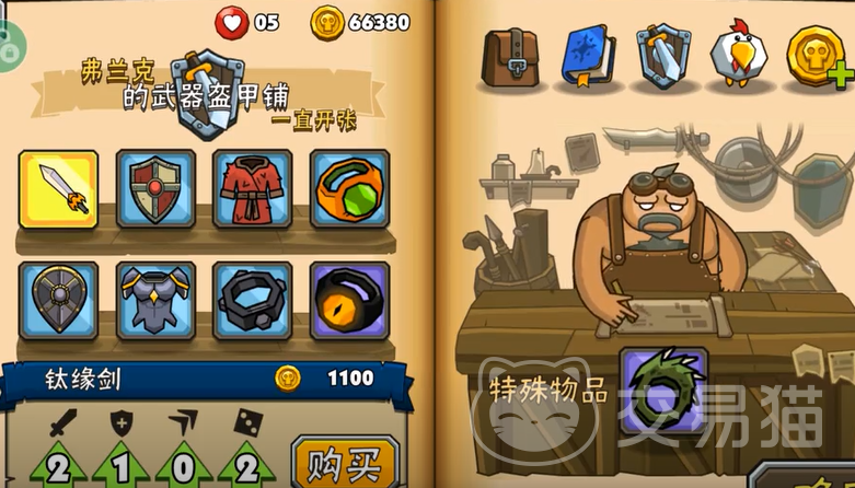 虽然游戏中的技能只有2个,但是通过这些简单的技能搭配上很灵性的跳跃,就可以在战斗中,打出非常亮眼的操作,在通关后,通常是会获得大量的游戏金币的,大家可以在燃烧村庄中,找到弗兰克,弗兰克开着一家铁匠铺,可以在其手上购买大量的武器和盔甲来强化自己!