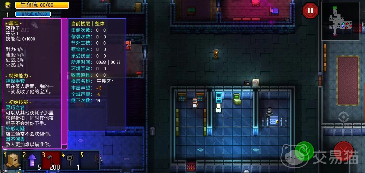 玩家在使用夜耗子之后就能够获得各种偷取的能力,包括偷钥匙,偷密码和金钱,自身的初始物品有种类非常齐全的。拥有神探手套这样的特殊能力,跟在对方后面,只需要一瞬间就能将对方的宝贝偷过来。