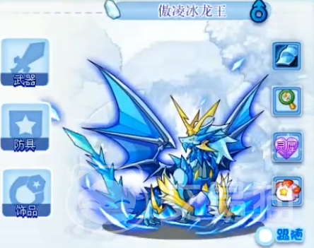 最后还有一只精灵,该精灵就是傲凌冰龙王,这是一只冰加龙系的双系精灵,属性上,该精灵的攻击属性是极其优秀的,这个攻击面板在100级时,甚至要强过之前的魔神武王一头,但是其他面板的话就要差一些的,不管是精力还是防御都是同类别中最差的一档。