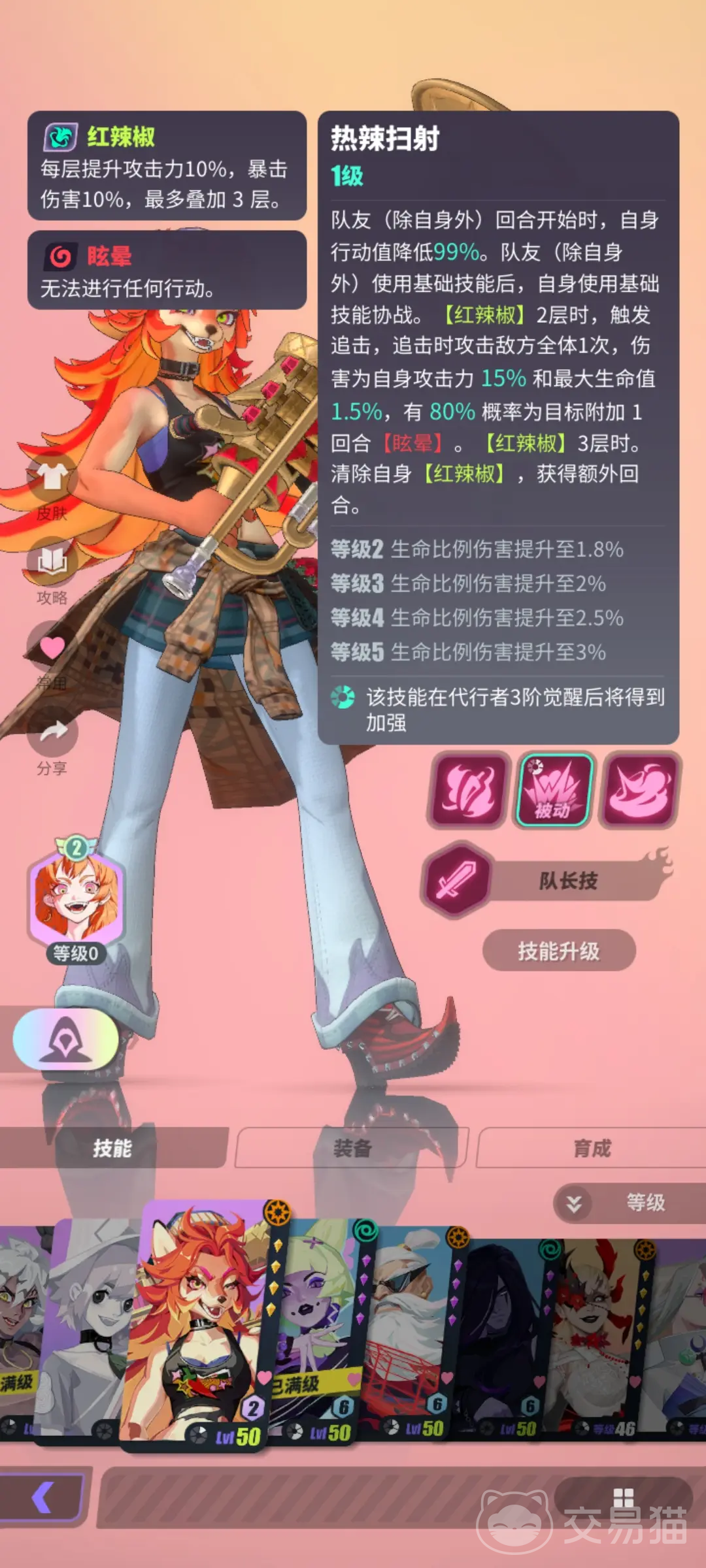 ”喷火”作为技能一,一次可以对两个敌人进行攻击,对这两名敌人造成的伤害基于自身最大生命值,而且在进攻之后还可以给自己增加一层红辣椒的效果。”热辣扫射”是她的觉醒技能,在队友进攻的回合,可以将自己的行动值降低,在队友将基础技能使用之后,她可以使用基础技能帮助队友作战。如果自己身上的红辣椒叠到两层的话,就可以将追击的效果触发,可以对敌方所有目标进行追击,攻击力基于自身最大生命值,而且会有较大的概率给对手添加眩晕的效果;红辣椒层数叠到三层的时候,可以得到额外的回合出手,不过层数也会清空。