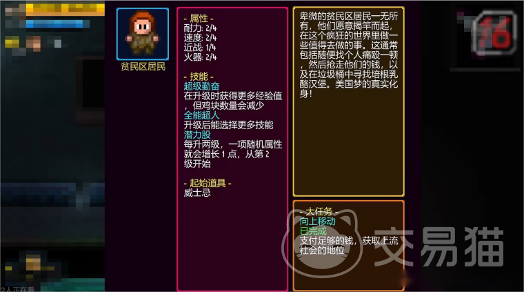 第三个是贫民区的居民,前期成长速度最快的角色,非常适合新手玩家的角色,升级非常的快也就导致属性提升非常的离谱,伤害和血量提升的快,过关以及生存的概率会大大的提升,非常适合新手过关使用。