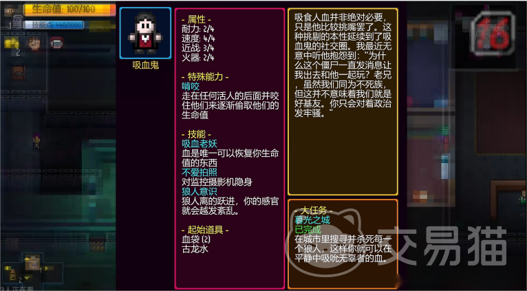首先第一个角色就是吸血鬼,摧毁二十个墓碑就能获取这个角色,这个角色是为数不多的可以自带恢复效果的角色,能让玩家一直保持健康的状态,只要有一定的偷袭经验就能保证这个角色无伤过关。