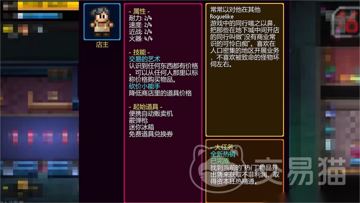 最后一个店主,需要玩家消费获取,只要收集足够的金币并且消费掉就能解锁,买东西的能手,能依靠自己的天赋快速获取到各种强大的道具,依靠这个技能能快速装备成型,只要拥有一点运气,过关也是非常简单的,这些角色都是非常建议各位使用,快去解锁并且体验一下吧。