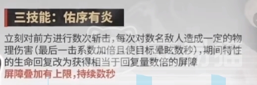三技能是进行多次连斩,可以对多名敌人造成一定物理伤害,同时最后一击还会额外提升加成的倍率,并使目标陷入眩晕,值得一提的是这期间特性所提供的回血还会变为提供数值更强的屏障。