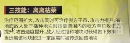 最后的三技能“离离枯荣”则是扩大治疗范围,并在攻击时可同时治疗己方干员,以及提升他们的攻击,而且这招还能播种地块,以此在队友经过时提供攻速和攻击力增益,在敌人经过时令其移动一定距离后被传送回来。