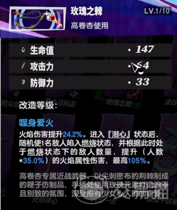 玫瑰之棘:这一装备是一个攻击高达64的近战武器,防御生命属性也有及格线水准,本身还自带技能“噬身爱火”,可以提升火焰伤害,并且配合高卷杏的潜行技能使用,还能随机对附近一名敌人附加燃烧,并进一步提升火焰伤害。