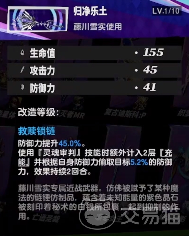 归净乐土:这是生命属性较高的一件装备,有着高额的防御力提升,配合藤川雪实的灵魂审判技能还可以额外获得两层充能,并偷取敌人两回合的防御力。