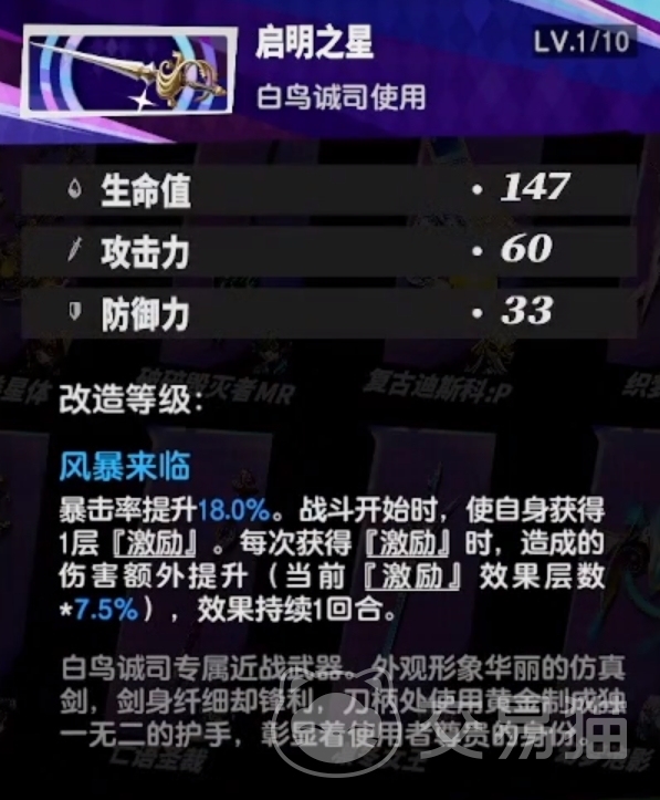 启明之星:它是各方面属性都比较优秀的装备,作为白鸟诚司的武器之一,可以通过特效“风暴来临”提升暴击率,而且战斗开始后还可以为角色提供额外的激励层数,并根据激励来获取一定的伤害提升。