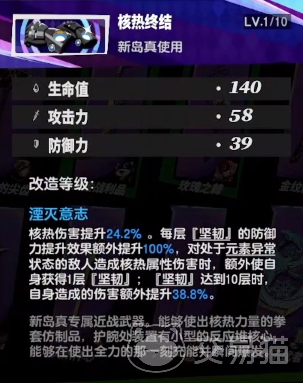 核热终结:这是新岛真的武器,属性普普通通,但技能“湮灭意志”可以提升核热伤害,而且还能根据新岛真技能所提供的坚韧来额外增强防御,并且对处于元素异常状态下的敌人攻击会额外获得坚韧,并能根据坚韧层数获得一定增伤。