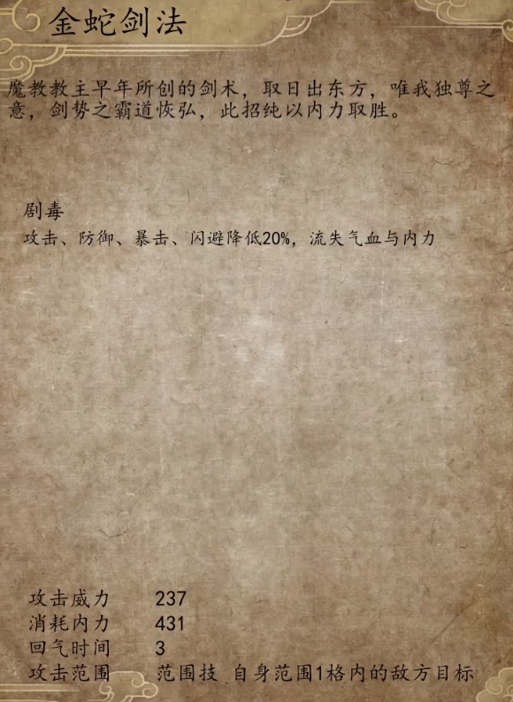 第二个推荐的是“金蛇剑法”,其本身属于魔教的一个早期剑法,虽然威力只有237,但附带的剧毒效果却非常厉害,能够降低敌人的攻防属性和暴击闪避,并且还能让它的气血与内力也持续损失。