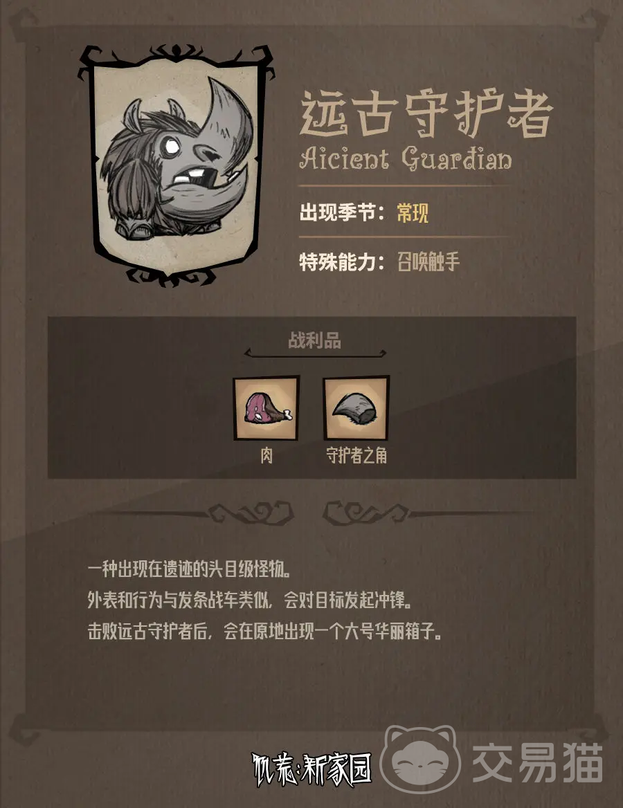 饥荒新家园远古守护者怎么打?远古守护者是一个像犀牛一样的怪物,击败这个BOSS是大家在游戏过程中会遇到的一个任务,但是有不少小伙伴就卡在这了,首先是寻找它所在位置面临困难,其次就是不知道怎么才能打败它,本期就分享一下这个BOSS的打法攻略,一起了解一下吧。