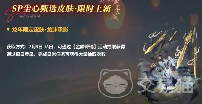 在春节期间还有不少的福利提供给大家,比如在1月31号到2月3号期间,小舞会有卯兔迎新和戴沐白虎虎生威的福利,直接登录就可以领取,喜欢这两个角色的小伙伴千万不要错过了,期间会限时返场千仞雪的两个限定皮肤。然后在2月9号~2月18号的时候还会放出龙年的限定皮肤,龙渊承影,这是不少玩家今年最期待的皮肤了。