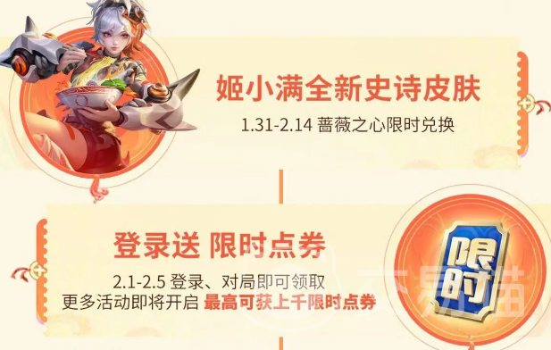 王者荣耀的春节活动日历出来的,最先上线的是1月31号的【蔷薇之心】限时兑换活动开启,需要使用蔷薇之心来兑换姬小满的史诗皮肤!2月1号登录的话就会阵容上千点限时点券!同时在2月4号登录的话,就可以参加新春养灵宝活动,这个活动的话,属于一个个性化养成玩法,和去年的小龙糕比较相似!