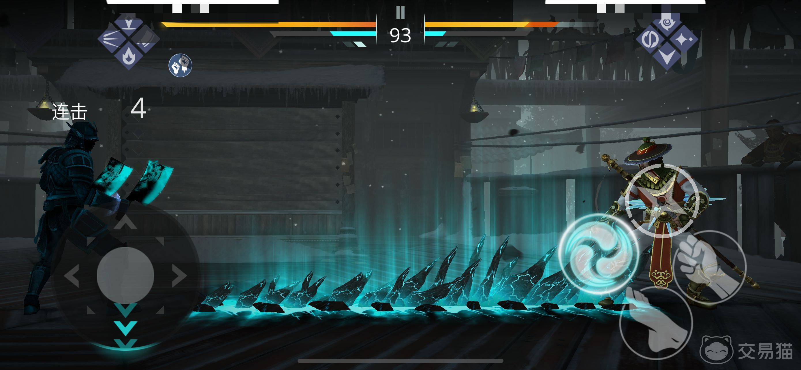 基础操作释放作为格斗游戏就必定少不了连招,通过控制方向移动摇杆配合手键和脚键可以赤手空拳的打出来一些基础的连招,单纯的释放摇杆上键则会跳跃,下键则会下蹲;后续还会有暗影技能按键,需要玩家们通过在对局内攻击以及挨揍来集齐暗影能量来释放,4个装备分别对应一个词条的暗影技能,释放的时候也要跟着滑动方向键。